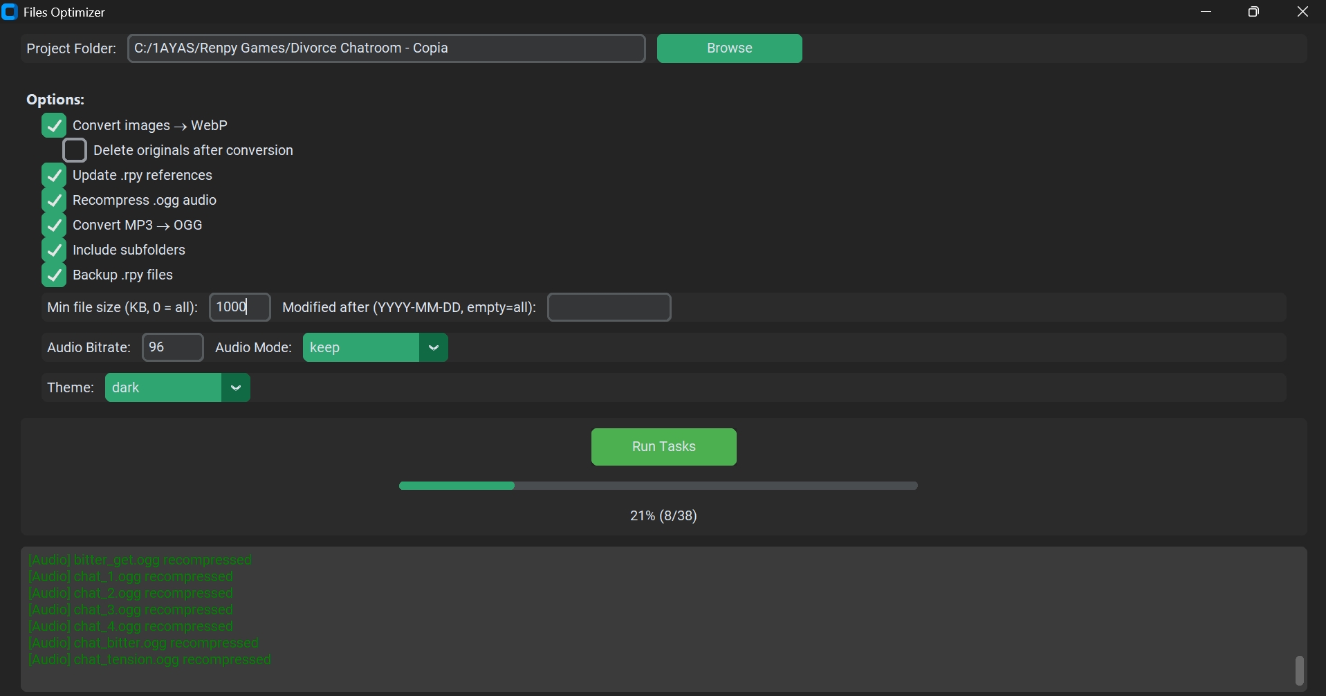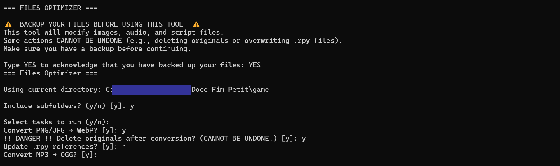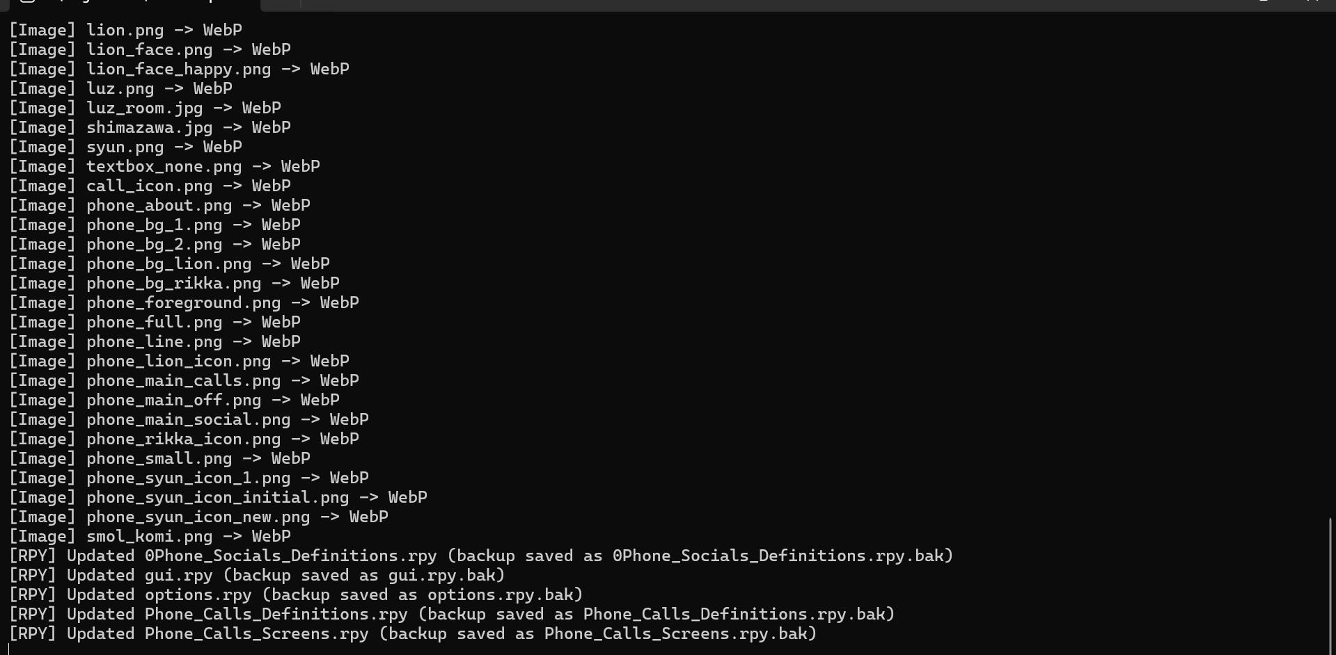 Update .rpy references: Automatically replace .png and .jpg mentions in your scripts with .webp, preventing game crashes. Also automatically creates .bak files. No more manually searching for each image path in dozens of files.