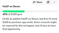 Hi! I’m super excited to announce that our goal to get MyGF on Steam is 40% complete! This was only possible thanks to the people who have bought the game so far, as well as the bit of cash I’ve b...