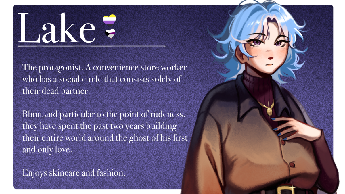 Lake is twenty-five years old, works a minimum wage job, and shares an apartment with the ghost of his boyfriend.